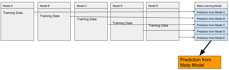 First, we train our base models in 10 folds, get their predictions and use them as training data for our meta model.