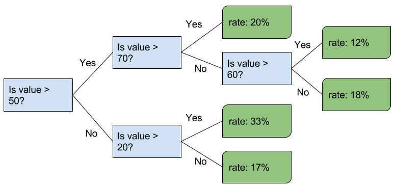 Another limitation for the RF model is, extrapolation. Actually, it is not just a limitation for the RF model, but for all tree-based models. A linear regression model, like the tipping model we mentioned, can predict a trend for the tips. While a decision tree model can only predict the outcomes from data previously encountered. As the decision tree makes a decision based on the form of "if input > value then go left, otherwise go right", likes the following diagram: