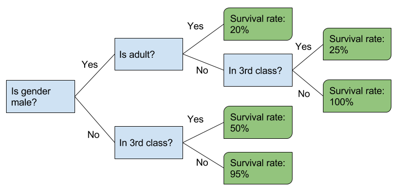 First thing first, from the words of Random Forest, we know that this model is about a lot of trees (so is rain forest, that is why I keep linking rain forest as random forest...). And the "tree" in the Random Forest model is actually a decision tree. Let's pick our Titanic Survivors project as an example, a decision tree should look like: