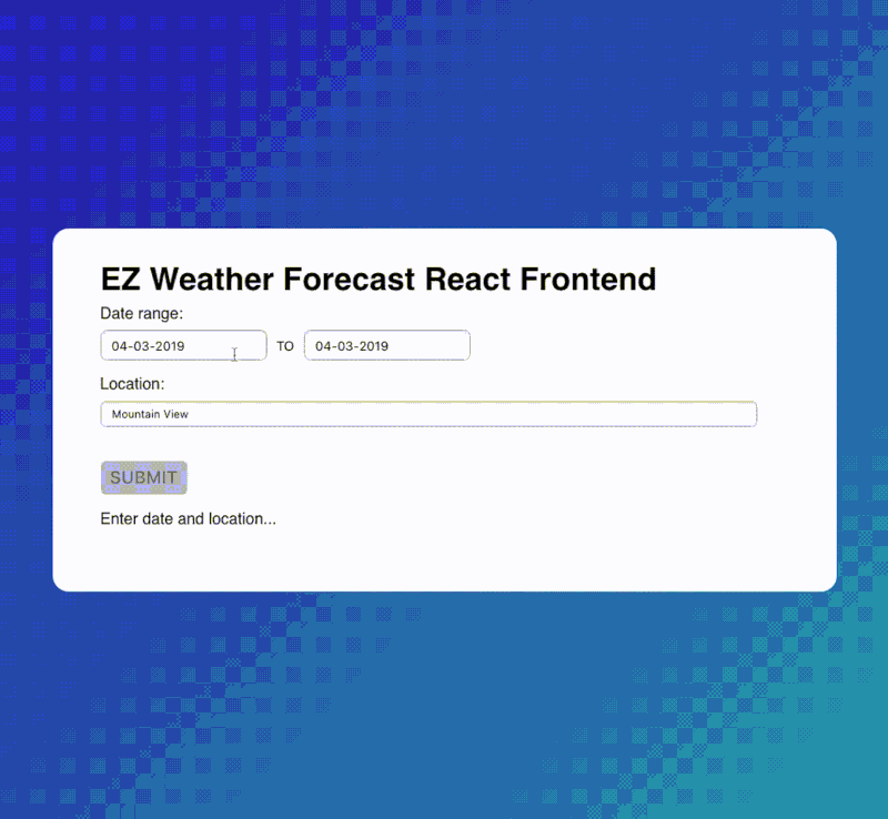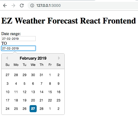 EZ Weather Forecast React Frontend Date range: TO ); }//render }//ezw ReactDOM.render( , document.getElementById('root') );