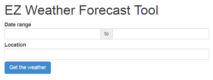 So our requirements are: a pair of date pickers , a location input box and a submit button for our frontend.